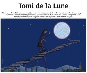 Notre Président est triste et avec lui tous les admirateurs de Ungerer. Voici ce Jean-Claude nous adresse : L’alsace a perdu son billant illustrateur , Tomi Ungerer. Il a croqué de multiples dessins qu’ils furent publicitaires , satiriques et souvent d’une joyeuse grivoiserie .Je vous laisse en pièces jointes  les articles des Dernieres Nouvelles  d’Alsace …
